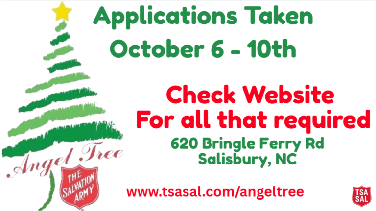 • 2025 Angel Tree Applications Intake:  Will be at the Salvation Army at 620 Bringle Ferry Road, Salisbury, NC  28144
